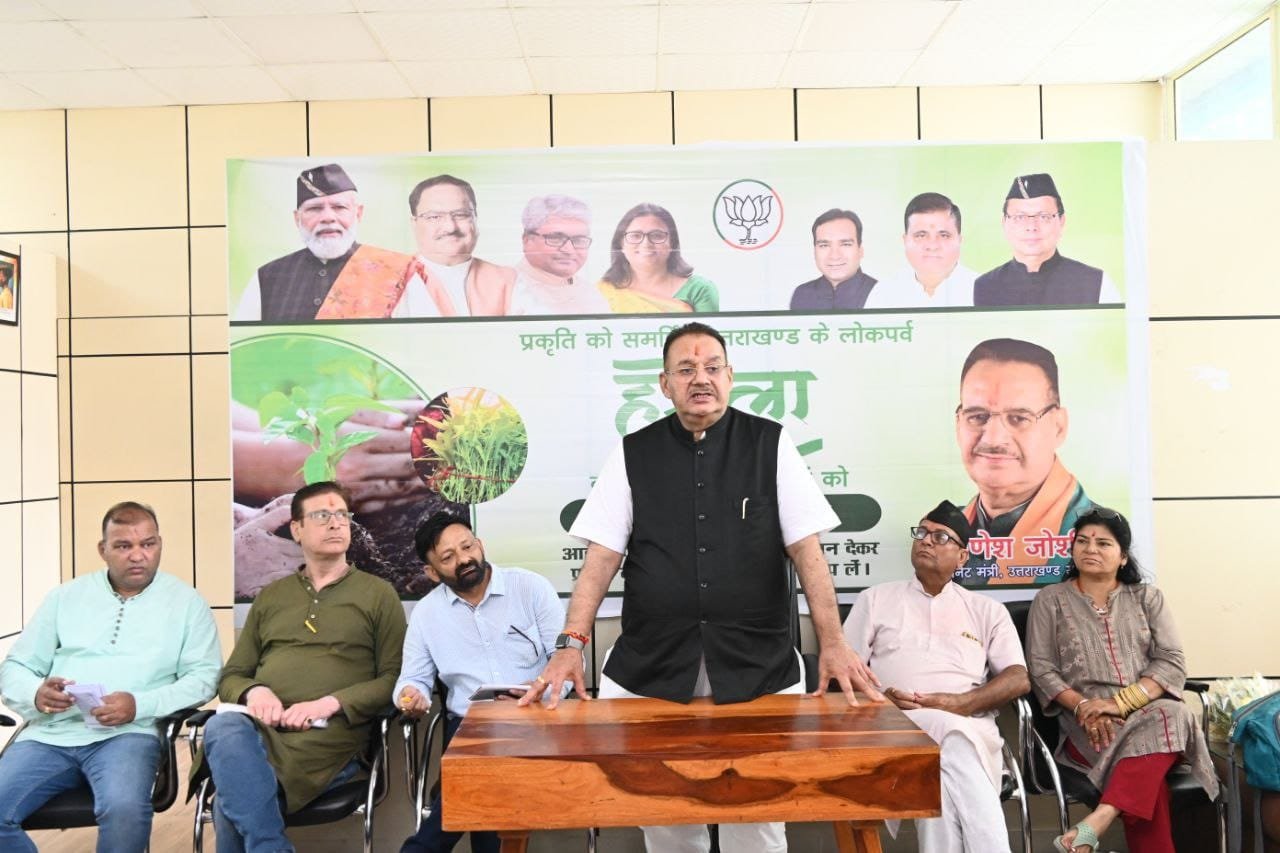 पार्टी कार्यकर्ताओं के साथ हर घर तिरंगा अभियान के अंतर्गत आयोजित होने वाले कार्यक्रमों की तैयारियों के संबंध में बैठक करते कैबिनेट मंत्री गणेश जोशी