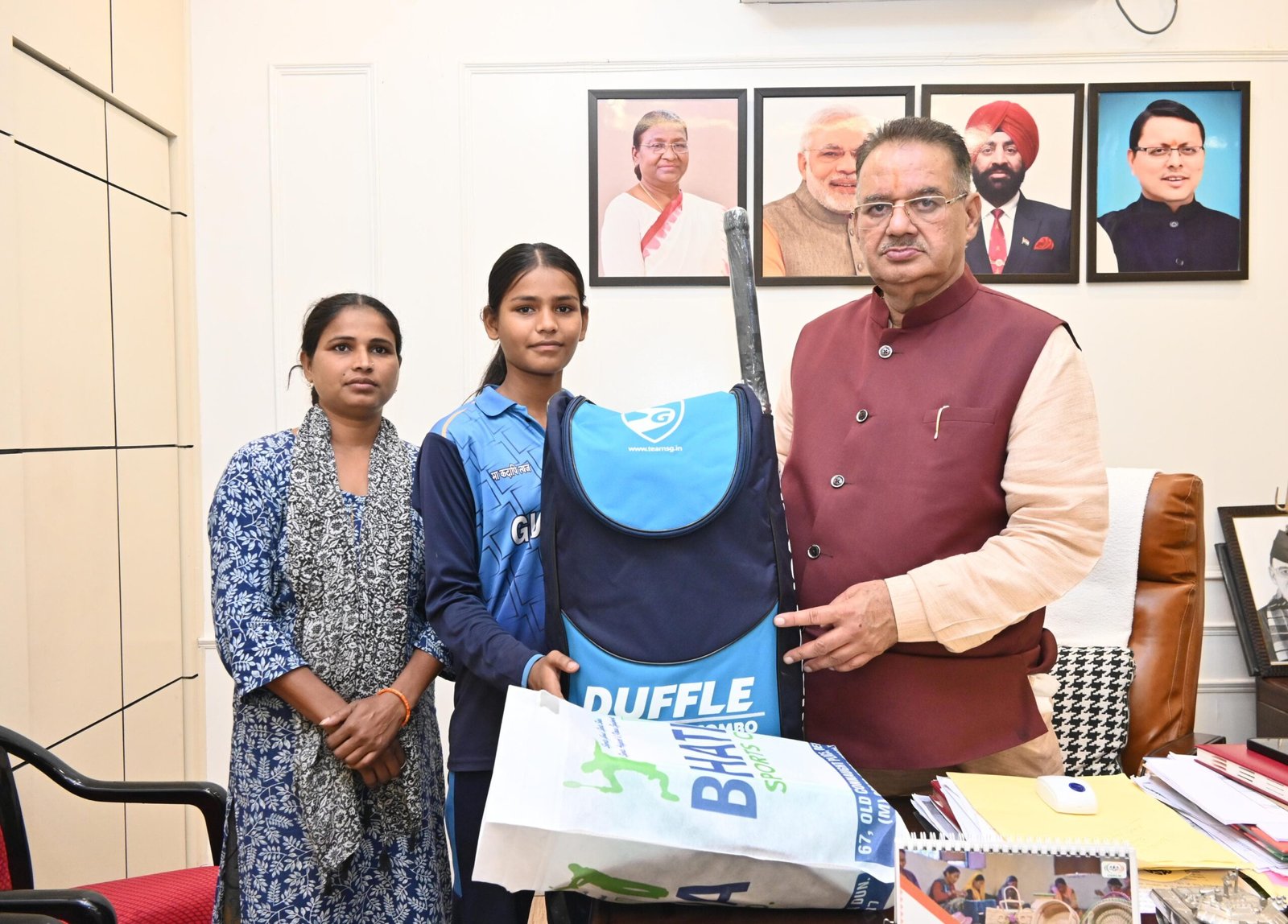 प्रेमनगर निवासी कक्षा 8वीं की प्रतिभावान छात्रा शगुन को क्रिकेट किट भेंट करते कैबिनेट मंत्री गणेश जोशी