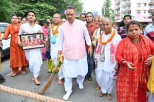 इस दौरान उन्होंने भगवान जगन्नाथ का आर्शीवाद लिया और भक्तों पर पुष्पवर्षा की। श्रीकृष्णा के भक्तों के लिए उन्होंने जूस, प्रसाद का वितरण भी किया। इस अवसर पर कैबिनेट मंत्री की धर्मपत्नी निर्मला जोशी, नेहा जोशी, वंदना बिष्ट, अशोक गुप्ता, मनोज क्षेत्री, ओमप्रकाश बवाड़ी, सुन्दर पयाल आदि उपस्थित।