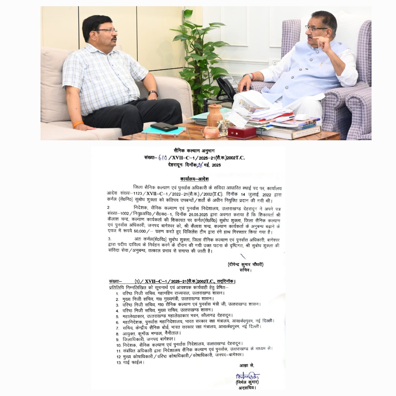 मंत्री गणेश जोशी ने सैनिक कल्याण विभाग के सचिव को निर्देश जारी करते हुए सम्बंधित जिला सैनिक कल्याण अधिकारी कर्नल सुबोध शुक्ला (सेवानिवृत्त) को तत्काल प्रभाव से बर्खास्त करने के निर्देश दिए