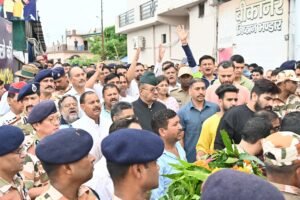 डोईवाला निवासी आईटीबीपी निरीक्षक शहीद चंद्र मोहन सिंह नेगी को श्रद्धांजलि अर्पित करते सैनिक कल्याण मंत्री गणेश जोशी